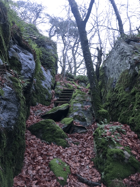 Vi följde stigen som gick upp i mellan klipporna. Plötsligt fanns det trappsteg så att det var lättare att klättra uppåt.