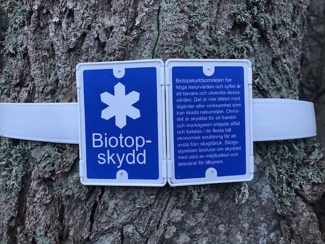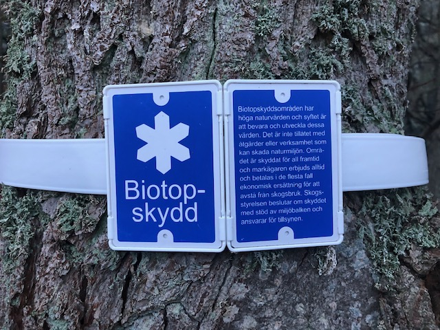Vi såg en skyllt och blev nyfikna ”Biotop skydd” ett nytt ord för mej, men så här står det på Naturvårdsverkets sida https://www.naturvardsverket.se/Var-natur/Skyddad-natur/Biotopskyddsomraden/