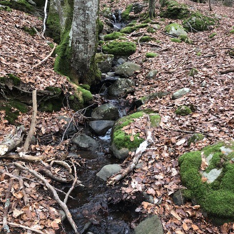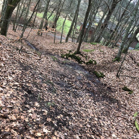 Backar är vi ju vana vid så det var bara att knata och gå. Upp, upp och upp. När vi kom högst upp på krönet var det som en platå. Det var många träd och en bäck porlade. Där fanns en bänk som passade utmärkt till att sitta och fika vid. När vi satt där såg vi ytterligare en bänk så här fanns det gott om fika platser.