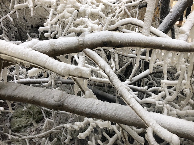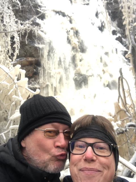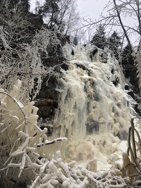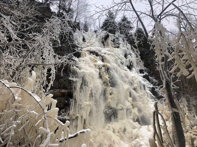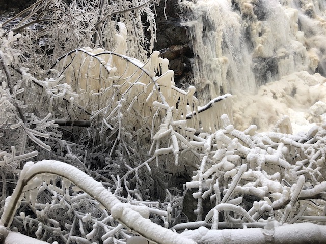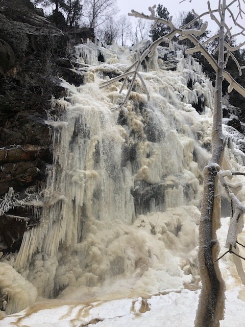 När vi parkerade bilen tittade vi ut över nejden och i fjärran såg vi vattenfallet. Vi hade tagit med oss broddar och satte på oss dessa. Parkeringen var en isbana, men med broddarna på gick vi lätt vidare utan att halka.