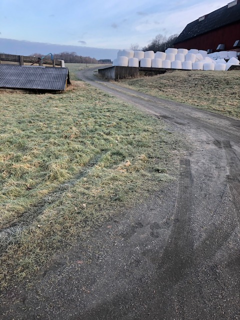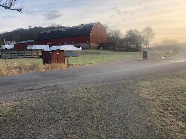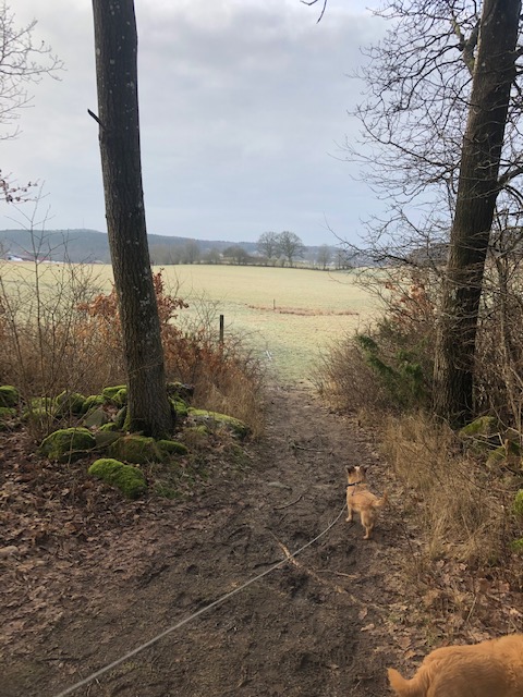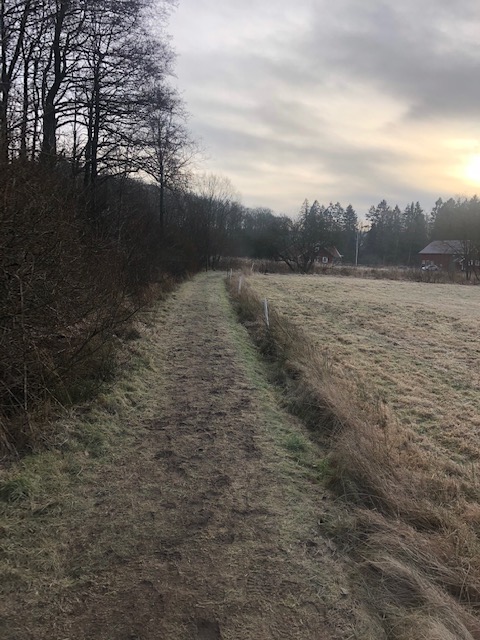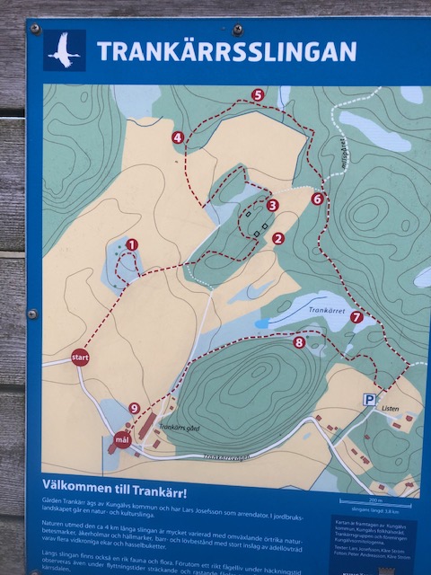 Vi gick slingan från Fontin och följde 5:ans slinga tills man kan svänga av till Trankärrsgården. Där gick vi upp mellan ladugården och ängen. Vi följde skogsvägen fram. Vissa delar är mycket leriga och man behöver verkligen skor som tål gyttja.