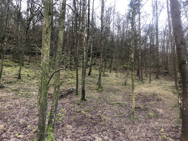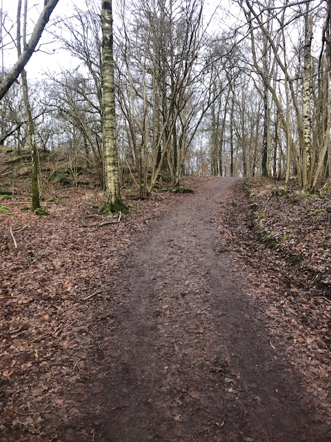 När man går ner för backen finns en stig in i skogen. Där skall man gå in!
