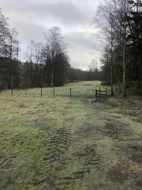 Här följer man sedan stigen fram, under sommaren kan det finnas boskapsdjur så man får vara lite försiktig så att man inte trampar i en ko-blaja. Man följer stigen fram tills man kommer ut på vägen där milen är (här finns även en parkering).
